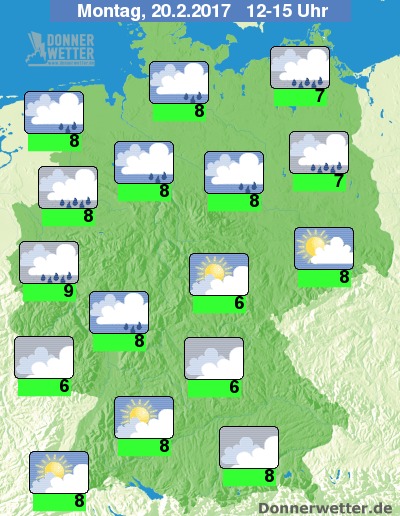 Heute Nachmittag zeigt sich im Süden und zum Teil noch im Osten die Sonne zwischen den Wolken, ansonst bleibt der Himmel über Deutschland jedoch weitgehend bedeckt und über der Nordwesthälfte des Landes fällt verbreitet Regen. Im Süden bleibt es noch trocken. Die Temperatur steigt auf 6 bis 9 Grad.