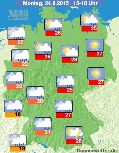In den frühen Abendstunden verbreiten sich die Regenwolken vom Westen bis in den Norden, insbesondere in der Region Niedersachsen. In Oberbayern ziehen Gewitterwolken entlang sodass mit Gewittern zu rechnen ist. Die Regionen Sachsen und Berlin zeigen sich sonnig mit klarem Himmel.