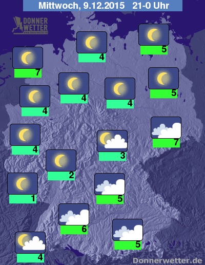 In der Nacht zum Donnerstag ist es über Bayern und Sachsen anfangs meist stark bewölkt, dabei bleibt es aber schon überwiegend trocken, bis zum Morgen klart der Himmel dann auf. Im übrigen Bundesgebiet ist es dagegen zunächst verbreitet sternenklar, in der zweiten Nachthälfte ziehen im Norden und Westen aber auch einige, meist lockere Wolken auf, dazu bleibt es aber trocken. Die Temperatur sinkt auf 6 Grad an der Nordsee und bis 0 Grad am Spessart. Stellenweise bildet sich Nebel oder Hochnebel, dabei ist teils Rauhreif möglich.
