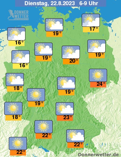 Die Temperaturen erreichen in den Frühstunden Werte um 16 Grad am Niederrhein und 24 Grad in der Lausitz.