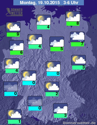 In der Nacht zum Montag ziehen im Norden oft dichte Wolken mit gebietsweise auch etwas Regen durch, auch am Alpenrand ist es oft dichte bewölkt und es fällt gebietsweise Regen. In den anderen Landesteilen zieht hingegen größtenteils lockere oder aufgelockerte Bewölkung durch, teils sind aber auch mal dichte Wolken möglich, dabei bleibt es aber trocken. Die Temperatur sinkt auf 9 Grad an der Wesermündung und bis 0 Grad am Bodensee. Stellenweise bildet sich wieder Nebel oder Hochnebel.