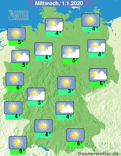 Abgesehen von regionalen teils zähen Nebelfeldern oder tiefhängender Bewölkung strahlt zu Jahresbeginn verbreitet die Sonne von einem heiteren oder meist nur locker bewölkten Himmel. Es bleibt niederschlagsfrei.