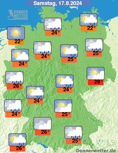 Am Samstag bleibt es über dem Norden und Nordwesten bei einem Sonne-Wolken-Mix häufig trocken. Sonst sind heute bei wechselnder bis starker Bewölkung im Süden und Südosten teils kräftige Schauer und Gewitter zu erwarten. Weiterhin ist mit von Westen her ostwärts ziehendem Regen zu rechnen, auch einzelne Gewitter sind möglich.