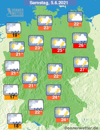 Am Samstag zeigt sich der Himmel verbreitet wechselnd, vor allem im Westen auch stark bewölkt. Bei einem häufig freundlichen und trockene Sonne-Wolken-Mix bleibt es am Samstag meist nur im äußersten Nordosten; in den übrigen Landesteilen muss auch heute gebietsweise mit kräftigen Schauern und Gewittern gerechnet werden. Örtlich besteht Unwettergefahr durch Starkregen, Hagel und Sturmböen.