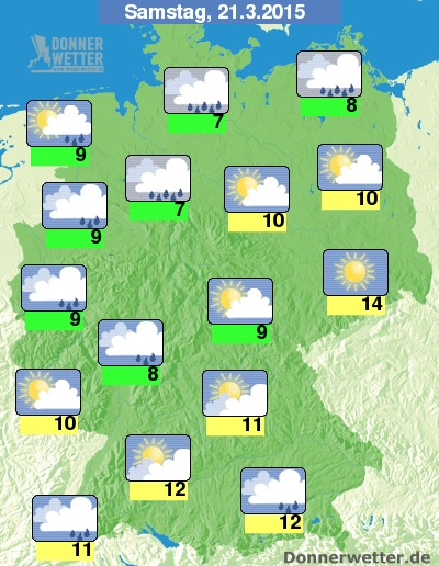 Am Samstag scheint im Osten und Südosten vor allem am Vormittag noch oft die Sonne und es ist trocken. In der Nordwesthälfte ist es hingegen schon meist bedeckt und es fällt zeitweise Regen. Am Nachmittag ist es auch im Süden und Osten oft stark bewölkt, dabei fällt besonders im Alpenvorland häufig Regen, im Osten bleibt es aber weitgehend trocken. Die Temperatur steigt auf 7 Grad im südlichen Niedersachsen und bis 14 Grad in Dresden. Im Nord- und Ostseeumfeld weht ein zeitweise starker und in Böen stürmischer Wind.