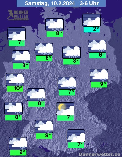 In der Nacht ist der Himmel meist stark bewölkt oder bedeckt. Im Norden und Osten bleibt es bis auf einzelne Schauer im Ostseeküstenumfeld anfangs weitgehend trocken. Von Südwesten her zieht in der ersten Nachthälfte Regen auf, der sich im weiteren Nachtverlauf auch auf die nördlichen Landesteilen ausdehnt.
