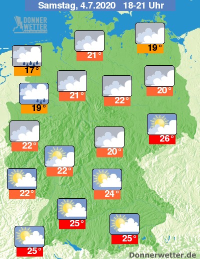 Die Temperaturen sinken im späteren Abendverlauf auf Werte um 22 bis 17 Grad ab.