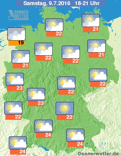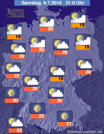 In der ersten Nachthälfte klart der Himmel zwischen Mosel und Oberbayern häufig auf, weiter nördlich bestimmen meist lockere Wolkenfelder das Himmelsbild. Schauer bleiben aus, die Temperaturen sinken nur leicht auf Werte um 22 bis 18 Grad C.