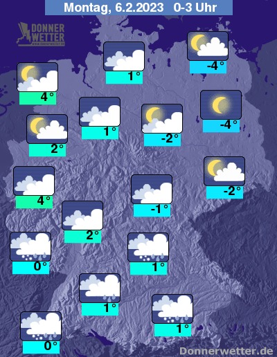 In der Nacht auf Montag zeigt sich der Himmel meist stark bewölkt oder bedeckt, geringere Bewölkung findet sich vor allem über der Osthälfte. Im Süden sind in der Nacht noch letzte Niederschläge möglich, sonst bleibt es weitgehend trocken.
