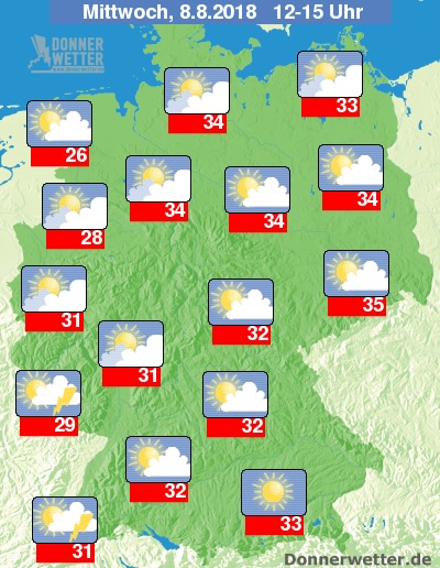 Heute Nachmittag können sich entlang des Rheins einzelne Schauer und Gewitter bilden, auch in der übrigen Westhälfte ist es teils stärker bewölkt, teils aber auch heiter und weitgehend trocken. Über der Osthälfte ist es weitgehend heiter bis sonnig und trocken. Die Temperatur liegt bei 26 Grad an der Nordsee und bis 35 Grad in der Lausitz.