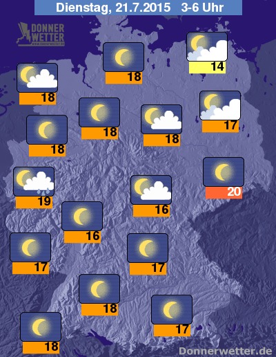 In der kommenden Nacht sind vor allem im Nordosten, gebietsweise aber auch im Westen Deutschlands dichte Wolken unterwegs, die für vereinzelte Schauer sorgen können. Im übrigen Bundesgebiet zeigt sich der Himmel jedoch sternenklar oder nur leicht bewölkt und es bleibt trocken. Die Temperatur sinkt auf 20 Grad in Dresden und bis 14 Grad in Vorpommern.