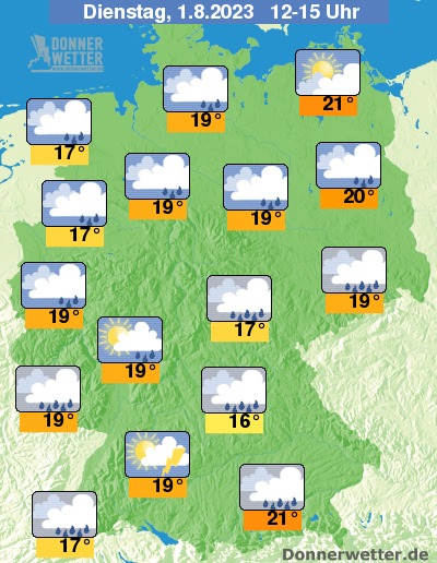 Heute Nachmittag ziehen oft dichte Wolken übers Land hinweg, zumindest zwischendurch können sich aber auch Auflockerungen zeigen. Es bilden sich allerdings immer wieder, zum Teil auch kräftige Schauer, örtlich können sich zudem auch Gewitter entwickeln. Die Temperatur liegt bei 17 Grad an der Nordsee und bis 21 Grad im Raum München.