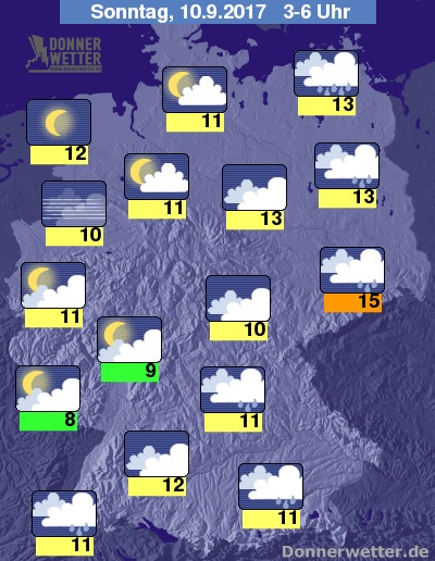 In der zweiten Nachthälfte lockern die Wolken zwischen Ostfriesland und dem Pfälzer Wald weiter auf, vereinzelt gelingt sogar mal ein Blick auf die Sterne. Regional kann sich Nebel bilden. In der Ost- und Südosthälfte setzen sich zum Teil kräftige Schauer zunächst fort, schwächen im weiteren Nachtverlauf aber allmählich ab.