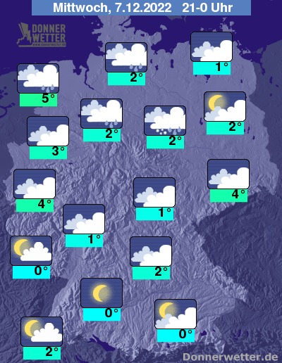 In den Abendstunden bleibt es über weiten Landesteilen bei starker Bewölkung, im südlichen Deutschland kann es im weiteren Verlauf auch zunehmend auflockern, örtlich kann sich Nebel bilden. Im Norden und der Mitte sind weitere Regen-, Schneeregen- oder Schneeschauer möglich, sonst bleibt es meist trocken.