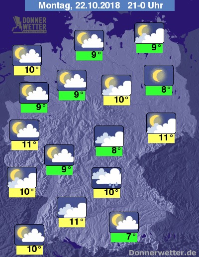 Am späten Abend bleibt es im Norden bei teils lockerer, teils aufgelockerter Bewölkung. Dichtere Wolken, aus denen aber nur selten auch mal Schauer fallen, beschränken sich meist auf den Südosten des Landes.