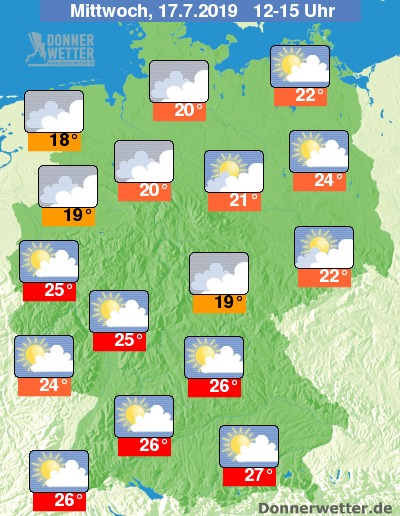 Am Mittag und Nachmittag zeigt sich der Himmel über weiten Landesteilen heiter bis wolkig oder aufgelockert bewölkt. Im Norden bleibt es zunächst noch bei einer geschlossenen Wolkendecke, im Nachmittagsverlauf lockert es aber auch hier häufig auf. An der Nordseeküste muss in den nächsten Stunden mit einzelnen Schauern, im Alpenvorland auch möglichen Gewittern gerechnet werden; sonst bleibt es meist trocken.
