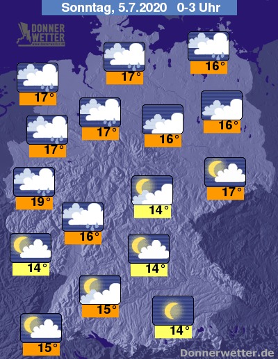 Die Temperaturen sinken in der Nacht auf Werte um 19 Grad im Rheinland und um 14 Grad im Altmühltal.