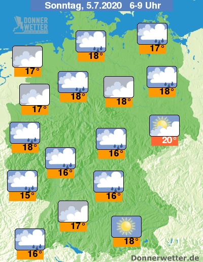 Der Sonntag startet dann vielerorts mit dichten Wolken, aus denen auch zeitweise Regen fällt. Einzelne Lichtblicke gibt es in den Frühstunden vor allem noch im äußersten Südosten sowie im Alpenvorland.