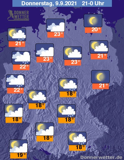 Die Temperaturen gehen in der ersten Nachthälfte auf Werte um 23 Grad im norddeutschen Tiefland und 18 Grad am Alpenrand zurück.