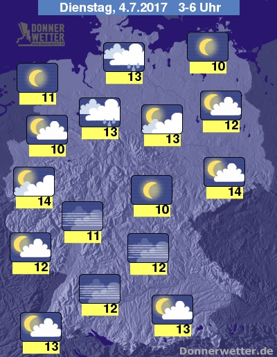 In der Nacht zum Dienstag ziehen über den Norden gebietsweise dichte Wolken aus denen sich einzelne Schauer bilden. Im übrigen Bundesgebiet ist der Himmel hingegen meist locker bewölkt und häufig auch sternenklar, dazu bleibt es trocken. Die Temperatur sinkt auf 14 Grad in Dresden und bis etwa 10 Grad an der Müritz.