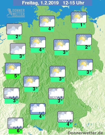 Die Temperaturen erreichen Werte um 1 Grad C in Nordvorpommern und um 6 Grad C am Oberrhein.