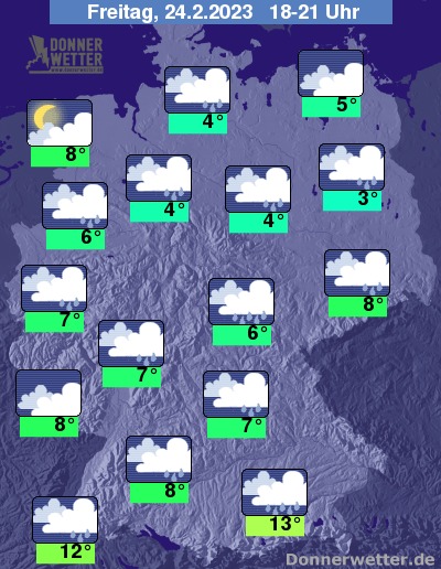 Heute Abend bleibt der Himmel bedeckt und es fällt verbreitet Regen, hier und da mischen sich auch Schneeflocken in die Niederschläge. Von Nordwesten klingen die Niederschläge im weiteren Verlauf dann wieder ab. Die Temperatur liegt bei 3 Grad in Potsdam und 13 Grad in München. An der See weht ein oft stürmischer Wind.