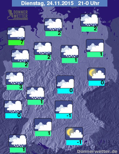 Heute Abend nimmt die Bewölkung auch im Osten und im Süden der Republik immer weiter zu, jedoch bleibt es hier bis Mitternacht weitgehend trocken, im übrigen Bundesgebiet hält sich eine geschlossene Wolkendecke, dazu fällt immer wieder Regen, Schneeregen oder auch Schnee. Verbreitet muss mit glatten Straßen gerechnet werden! Im Norden weht ein frischer bis starker, an den Küsten auch ein stürmischer Wind.