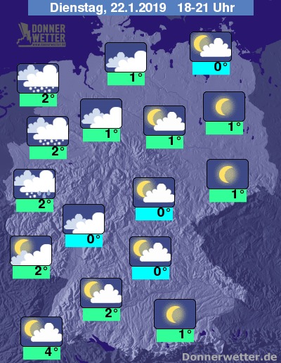 Am Abend fällt im Westen etwas Schnee oder Schneeregen mit Gefahr von Glätte auf Straßen und Gehwegen, sonst bleibt es trocken und vor allem nach Süden und Osten hin zeigen sich häufig auch Mond und Sterne.