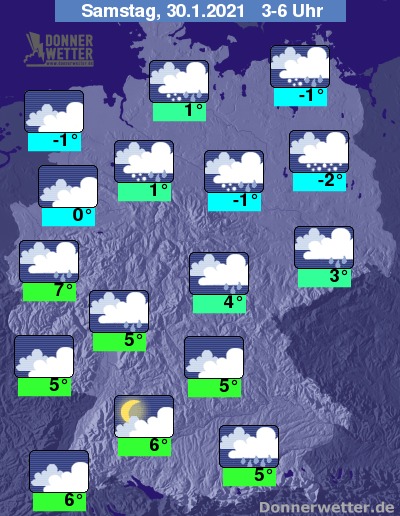 Während der zweiten Nachthälfte trocknet es im Südwesten vorübergehend ab, während in den anderen Gebieten weitere Niederschläge fallen, in Norddeutschland meist in Form von Schnee oder Schneeregen mit erheblicher Rutschgefahr, sonst als leichter Regen oder Sprühregen.
