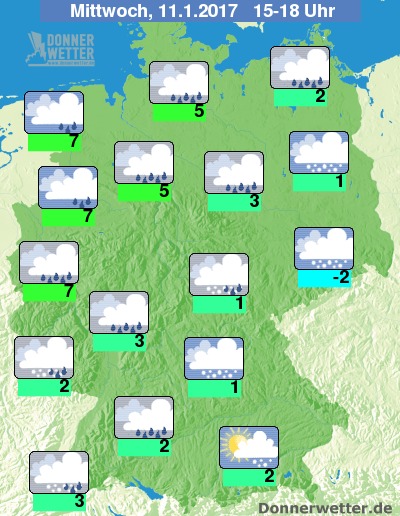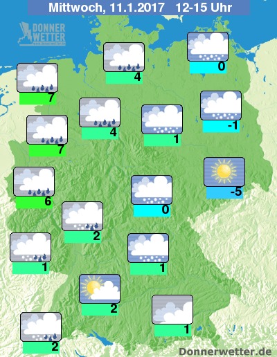 Am Mittwochnachmittag bleibt der Himmel über weiten Teilen des Landes dicht bewölkt oder bedeckt, freundlichere Phasen sind meist nur im Vogtland sowie auf der Schwäbischen Alb zu erwarten. Verbreitet muss am Nachmittag mit Niederschlägen gerechnet werden, die im Nordwesten als Regen, im Südwesten als Schneeregen und in den Mittelgebirgen sowie entlang der Oder auch als Schnee fallen.