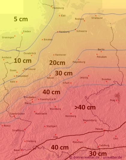 Die Karte zeigt die zu erwartenden Neuschneemengen in Deutschland bis Samstag (14:00 Uhr):