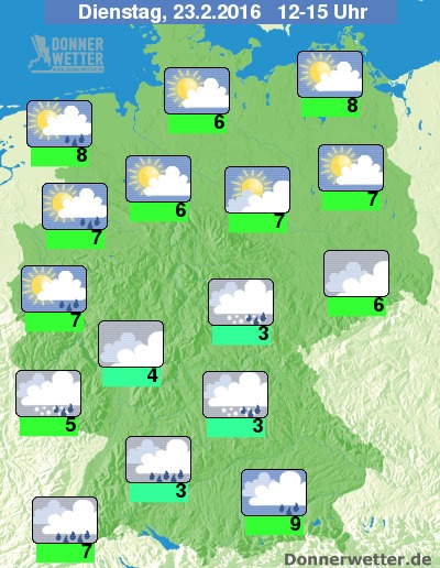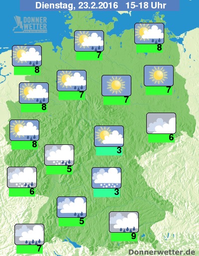 Die Temperaturen erreichen am Nachmittag Werte um 3 Grad C im Thüringer Wald und um 9 Grad C am Alpenrand.