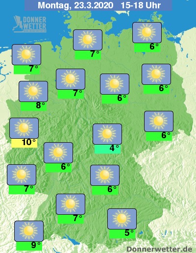 Die Mittags- und Nachmittagsstunden bescheren dem gesamten Land strahlenden Sonnenschein und einen stahlblauen, meist wolkenlosen Himmel. Der Ostwind weht teils frisch, die Lufttemperaturen erreichen Höchstwerte um 4 Grad in Franken und um 10 Grad im Rheinland.