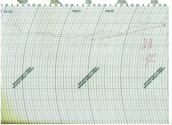 Luftdruck im Aufwind! Unser Luftdruckschrieb, aufgezeichnet an unserer Wetterstation in Bonn, zeigt deutlich den steigenden Luftdruck ab vergangenem Freitag. Das Hoch über dem Baltikum  wird in den kommenden Tagen verbreitet für sonnige und trockenes aber kühles Wetter im Land sorgen.