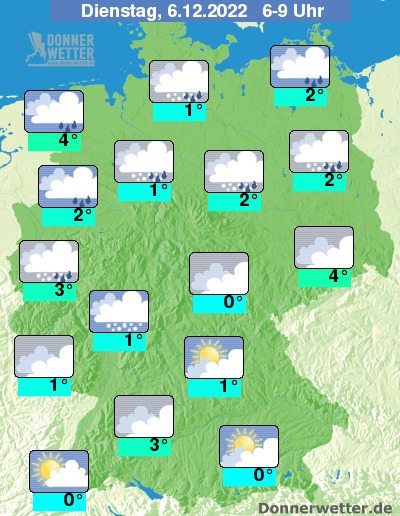 In der Nacht auf Dienstag fällt vor allem von NRW bis zur Ostsee immer wieder Regen, Schneeregen oder Schnee, im Südosten des Landes regnet es zeitweise auch kräftiger. Sonst bleibt es unter einer meist geschlossenen Wolkendecke überwiegend trocken, einzelne Auflockerungen und Nebelbildung gibt es lokal im Süden und Südwesten.