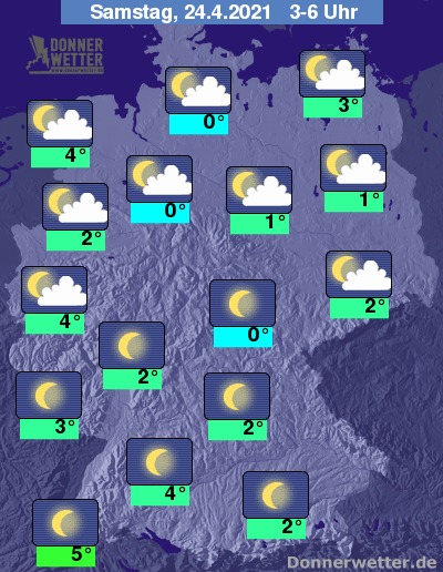 In der Nacht zum Samstag ist der Himmel vor allem über der Südhälfte des Landes verbreitet sternenklar. Im Norden ist es anfangs noch oft sternenklar, jedoch ziehen im Nachtverlauf vielerorts mehr und mehr Wolken auf, dazu bleibt es trocken. Die Temperatur sinkt auf 5 Grad in Freiburg und etwa 0 Grad in Jena.