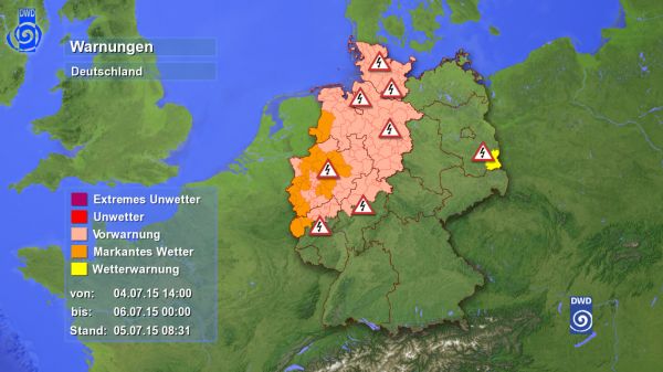 Heute Nachmittag ist es besonders vom Osten bis in den Süden verbreitet heiter bis sonnig und bis zum Abend weitgehend trocken. Weiter nach Westen und Norden hin ist es nur gebietsweise noch heiter, es ziehen zunehmend auch kompakte Quellwolken auf, die zu regional unwetterartigen Gewittern führen können. Gegen Abend sind auch im Osten und im Südwesten teils schwere Gewitter möglich. Die Höchstwerte liegen bei schwülwarmen 25 Grad an der Nordsee und sehr drückenden 37 Grad in Stuttgart.