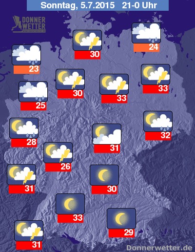 Heute Abend ist es im Süden noch oft sternenklar und weitgehend trocken, rund um den Schwarzwald sind jedoch Schauer und Gewitter möglich. Im übrigen Bundesland ist es teils aufgelockert, verbreitet aber auch stark bewölkt, dazu können sich zum Teil unwetterartige Gewitter entwickeln. Die Abendwerte liegen bei schwülheißen 33 Grad in Berlin und kühleren 23 Grad in Ostfriesland.