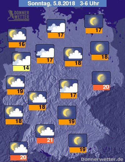 In der Nacht zum Sonntag ist es zum Großteil locker bewölkt bis sternenklar, zum Teil sind aber auch dichte Wolken möglich, dazu bleibt es aber weitgehend trocken. Die Temperatur sinkt auf 21 Grad im Raum Stuttgart und bis 14 Grad im Münsterland.