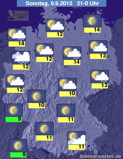 In der Nacht zum Montag ziehen im Norden und Westen der Republik verbreitet dichte Wolken mit Regen auf. Die Niederschläge breiten sich im weiteren Verlauf auch bis in die Landesmitte hin aus. Im übrigen Bundesgebiet ist es hingegen oft sternenklar oder nur locker bewölkt, nur hier und da ziehen auch mal dichtere Wolkenfelder durch, dabei bleibt es trocken. Die Temperatur sinkt auf 12 Grad in Papenburg und bis 4 Grad am Oberrhein.