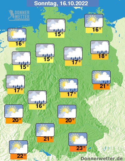 Am Sonntag zeigt sich im Süden und Norden oft die Sonne und es bleibt zumeist trocken. Im übrigen Land ist es teils stark bewölkt, teils zeigen sich Auflockerungen, es fällt gebietsweise Regen. Die Temperatur steigt auf 15 Grad in Hamburg und bis 23 Grad in München.