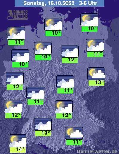 In der Nacht zum Sonntag ist der Himmel im Süden häufig gering bis wechselnd, sonst dagegen verbreitet stark bewölkt. Es bleibt weitgehend trocken, jedoch können dichte Wolken im Westen zum Morgen hin hier und da Regen bringen. Stellenweise bildet sich Nebel. Die Temperatur sinkt auf 14 Grad im Breisgau und 10 Grad in Vorpommern. An der Nordsee weht ein teils stürmischer Wind.