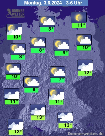 In der Nacht auf Montag sind anfangs vor allem noch in der Oberpfalz, im Bayerischen Wald und am Alpenrand noch schauerartige, teils auch gewittrige Regenfälle zu erwarten. Sonst ist es teils sternenklar, teils nur gering bewölkt und es bleibt meist trocken.