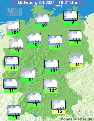 Heute Abend ziehen größtenteils kompakte Wolken durch und es zeigen sich nur selten mal kurze Auflockerungen. Es fällt immer wieder Regen oder es bilden sich einzelne Schauer. Die Temperatur liegt bei 9 Grad auf Rügen und bis 15 Grad in München.