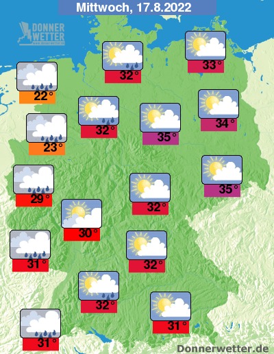 Am Mittwoch bleibt es über der Osthälfte noch oft heiter bis sonnig und dazu meist trocken. Weiter nach Westen hin ist es dagegen schon vielerorts und zunehmend stärker bewölkt, dabei bilden sich gebietsweise Schauer, örtlich entwickeln sich auch Gewitter. Die Temperatur erreicht teils nur 22 Grad an der Nordsee, aber drückend heiße 35 Grad in der Magdeburger Börde.