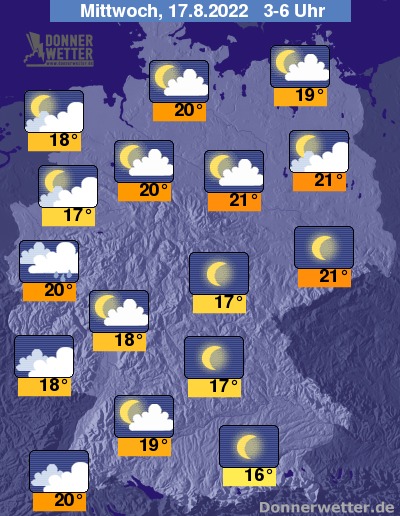 In der Nacht zum Mittwoch zeigt sich der Himmel über Bayern, Thüringen und Sachsen meist sternenklar. Vor allem in den westlichen Landesteilen ziehen oft viele und teils dichte Wolken durch, hier sind einzelne Schauer möglich. Im übrigen Land ist es locker bis aufgelockert bewölkt und trocken. Die Temperatur sinkt auf 21 Grad in Berlin und 16 Grad in München.