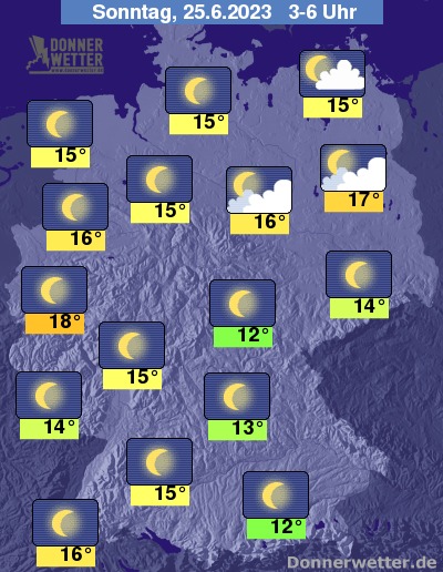 In der Nacht zum Sonntag können sich im Nordosten und Osten hier und da einige Wolken halten, sonst ist der Himmel über Deutschland aber sternenklar. Bei Tiefstwerten von 18 Grad in Köln und 12 Grad in Jena bleibt es überall trocken.