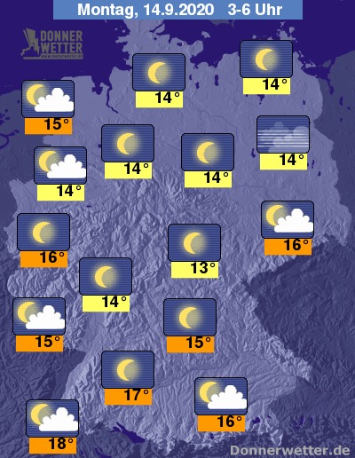 In der Nacht zum Montag ist der Himmel meist sternenklar, es ziehen aber auch hier und da einige, weitgehend locker bis aufgelcokerte Wolkenfelder durch, dazu bleibt es trocken. Die Temperatur sinkt auf 18 Grad im Oberrheingraben und bis 13 Grad im Grabfeld.