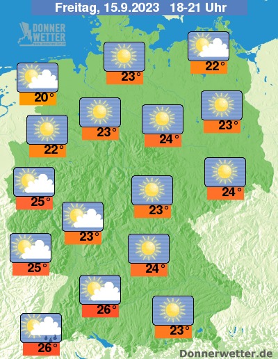 Heute Abend zeigt sich das Wetter weiterhin meist sonnig oder nur locker bewölkt. Im Südwesten sind örtlich auch dichte Quellwolken und seltene Schauer und Gewitter möglich. Die Temperatur liegt bei 20 Grad in Bremerhaven und rund 26 Grad in Stuttgart.