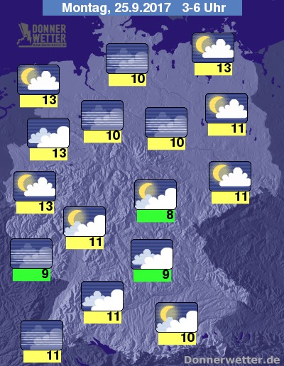 In der Nacht zum Montag sind über dem Süden und vorübergehend auch über den Osten dichte Wolken mit etwas Regen möglich, sonst zeigt sich der Himmel aber meist leicht bis aufgelockert bewölkt, hier und da auch sternenklar, dazu bleibt es trocken. Die Temperatur sinkt auf 13 Grad an den Küsten und bis 8 Grad im Eichsfeld.